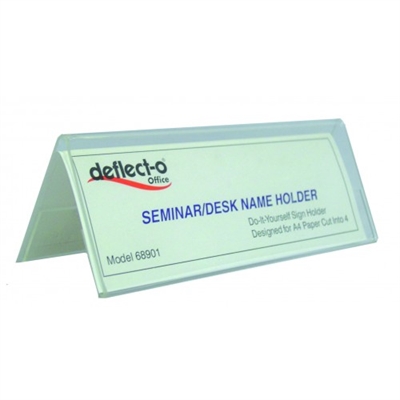 You can display your name or title in a clearly visible way on desks, counter tops or at meetings using the deflect-O Desk Name Holder